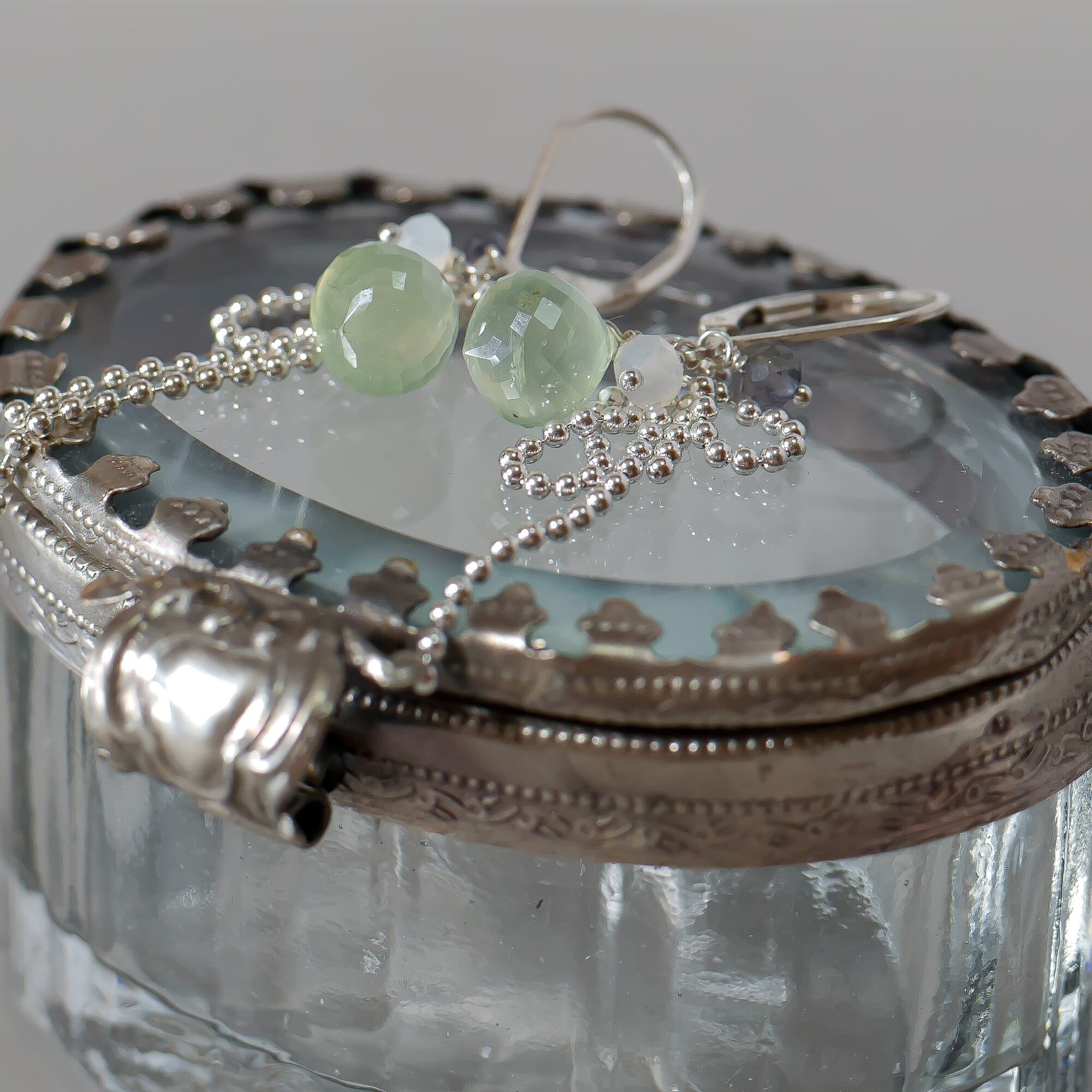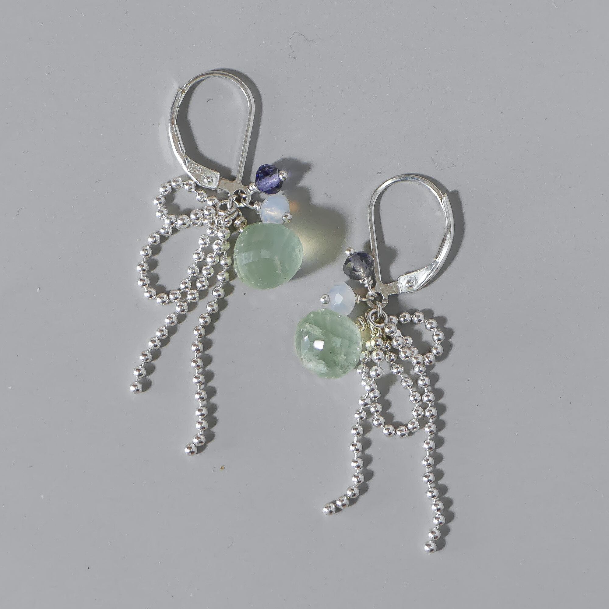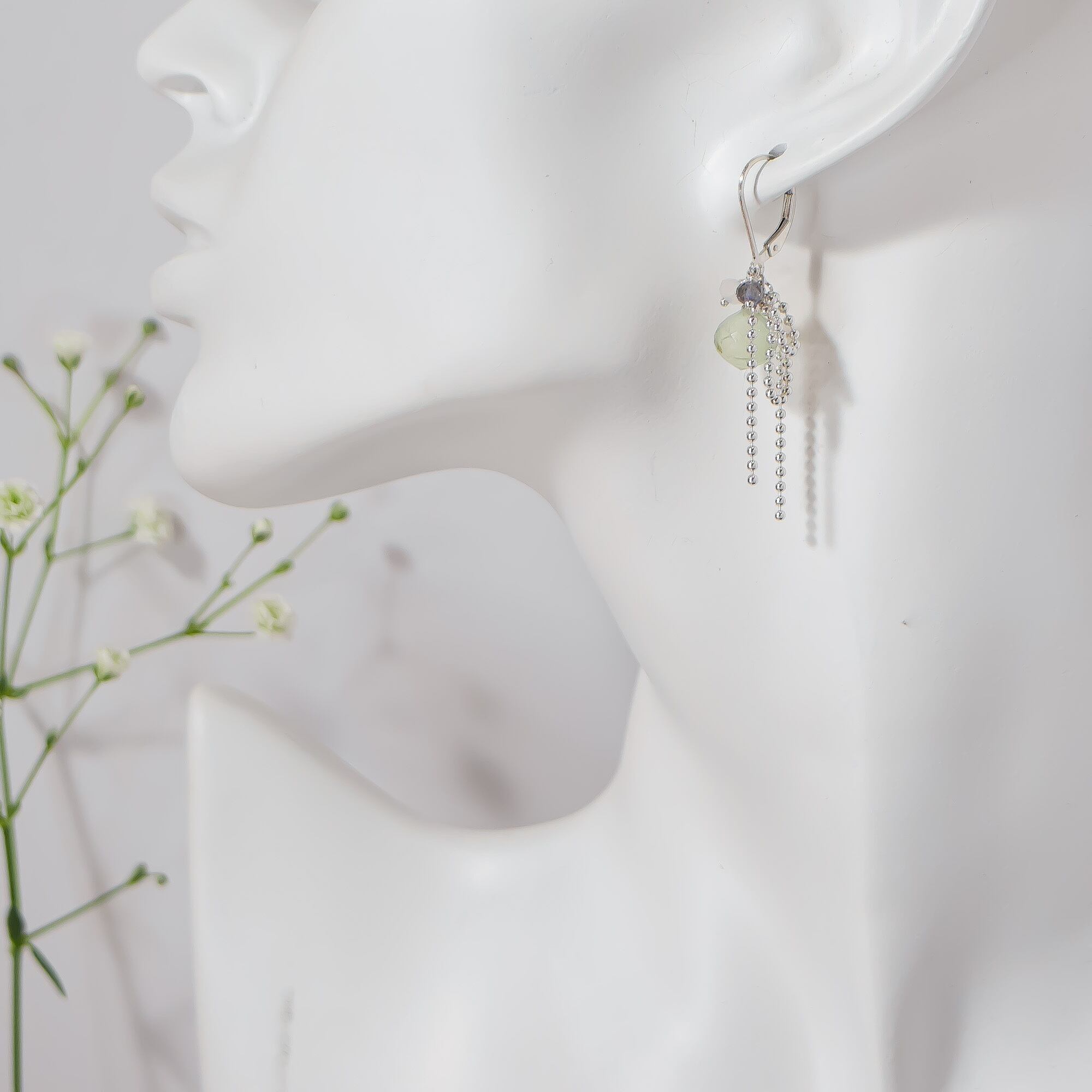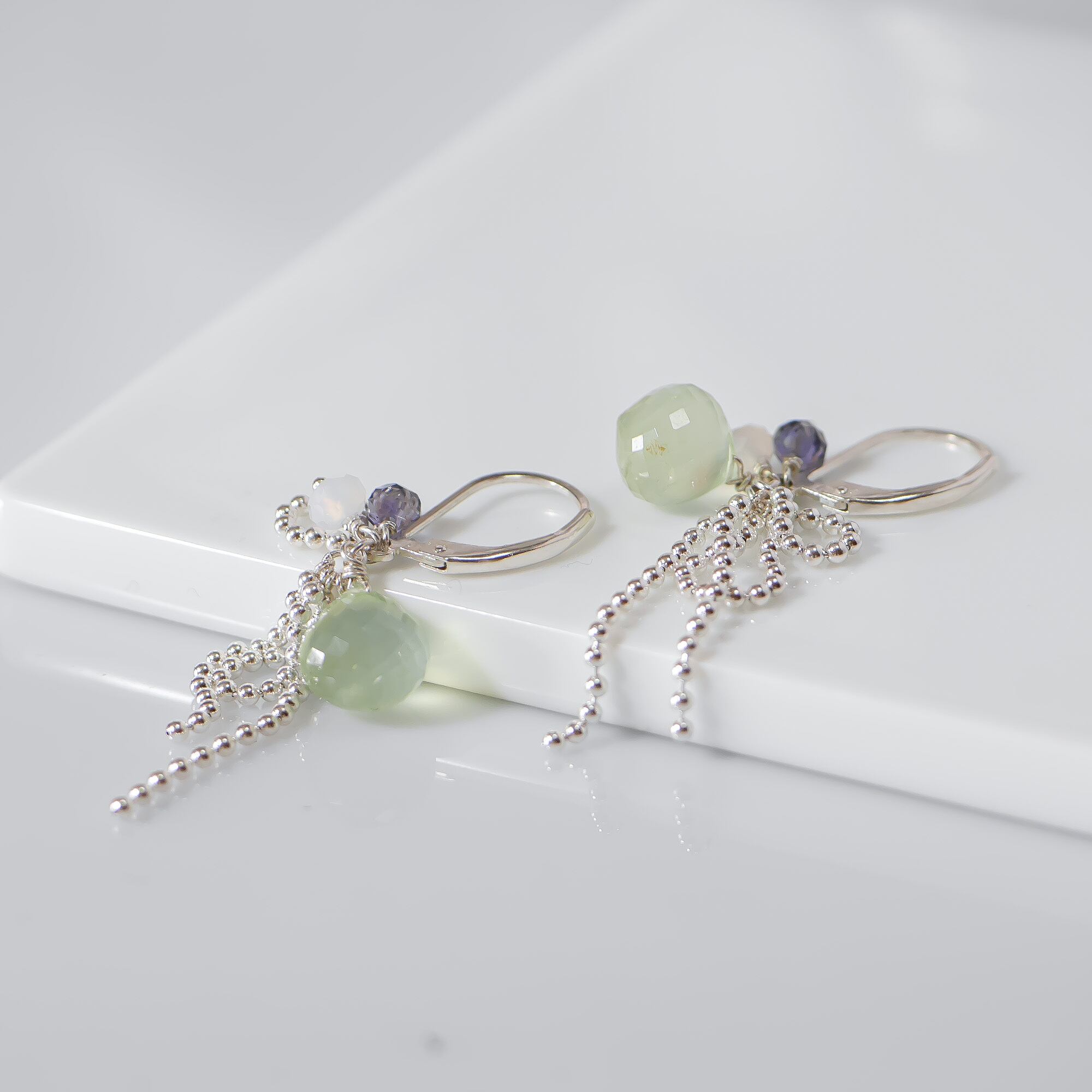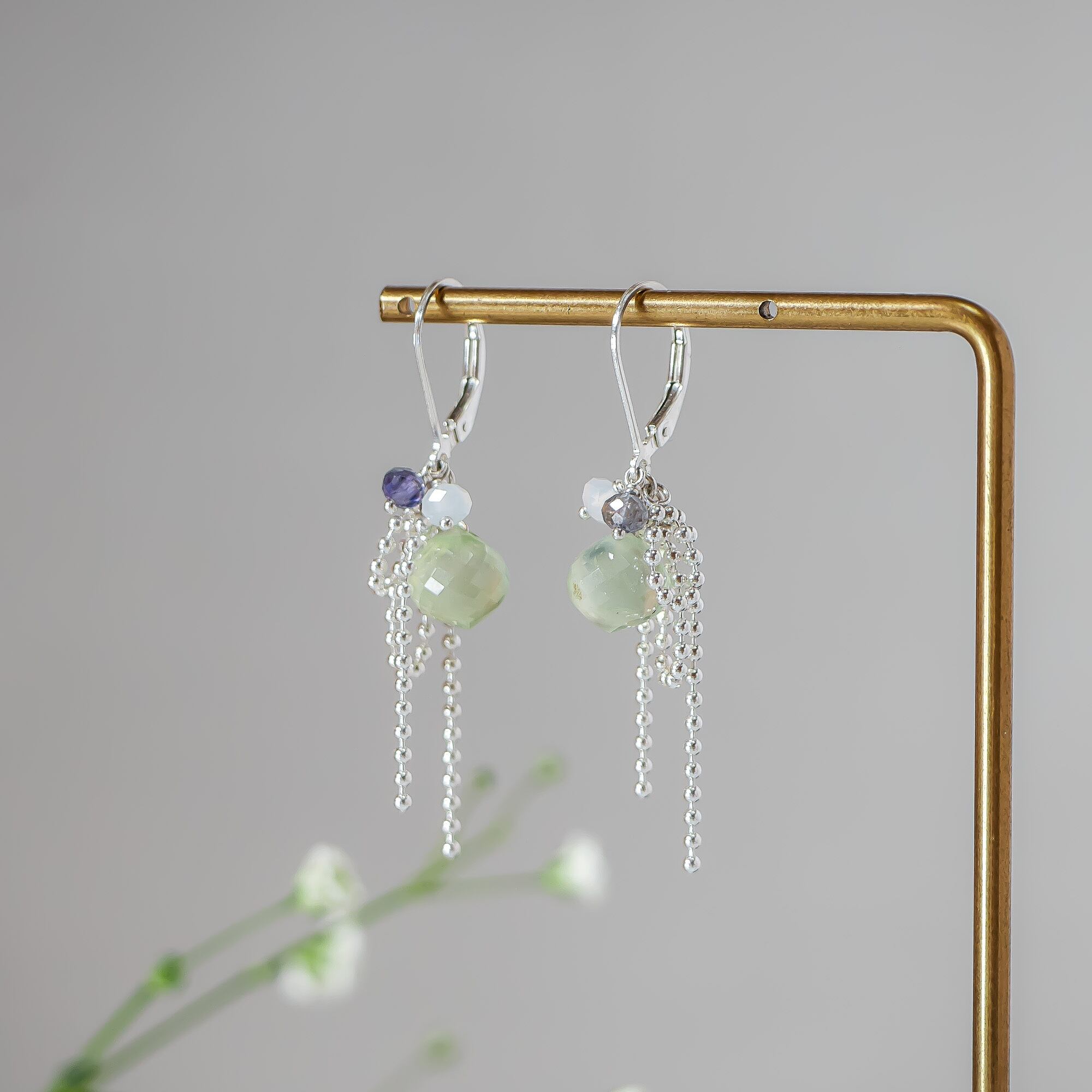 動くたびにやさしく揺れ、プレナイトの瑞々しい透明感を引き立てます。