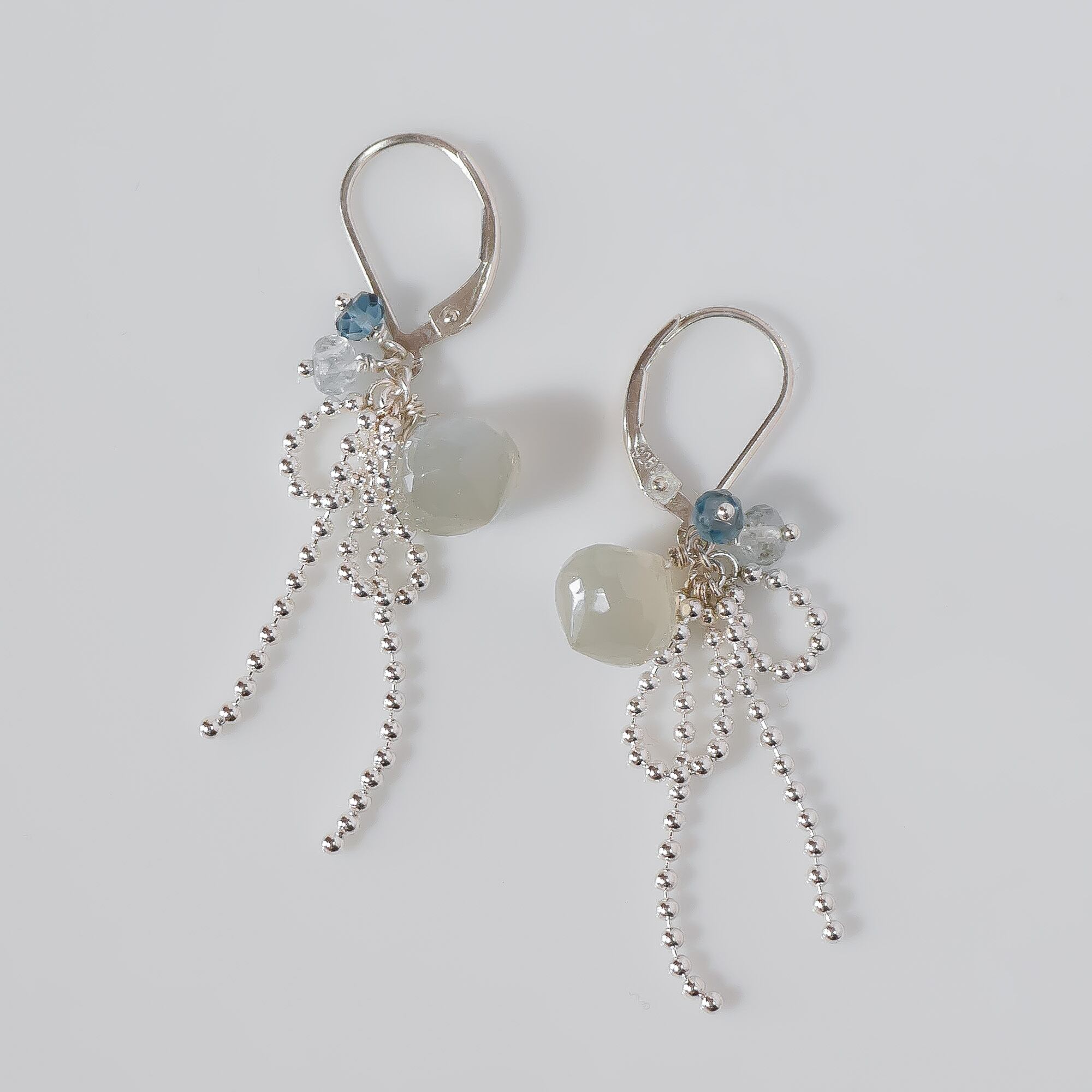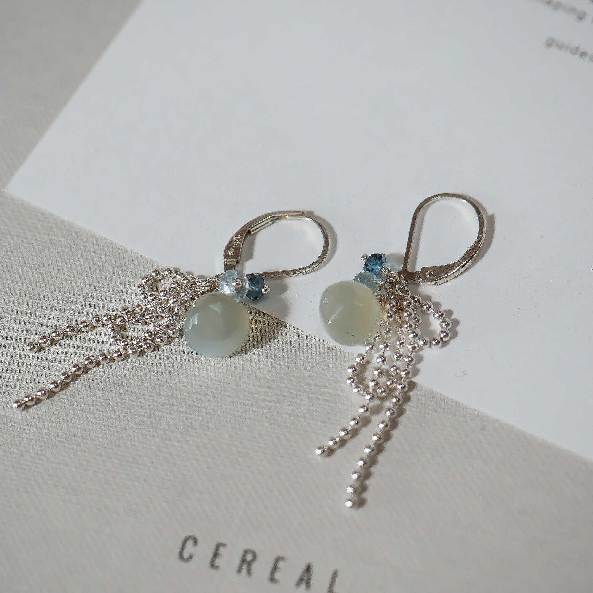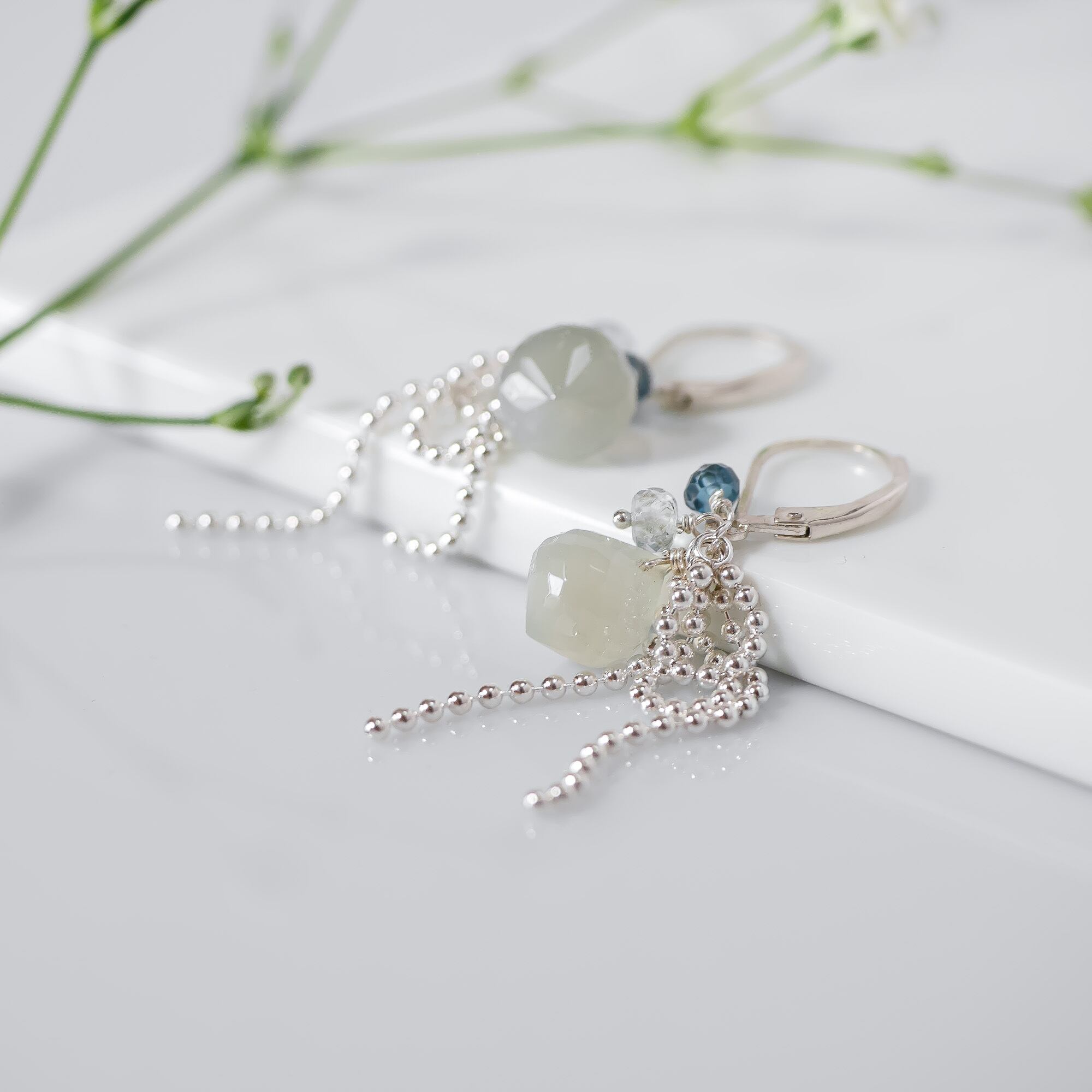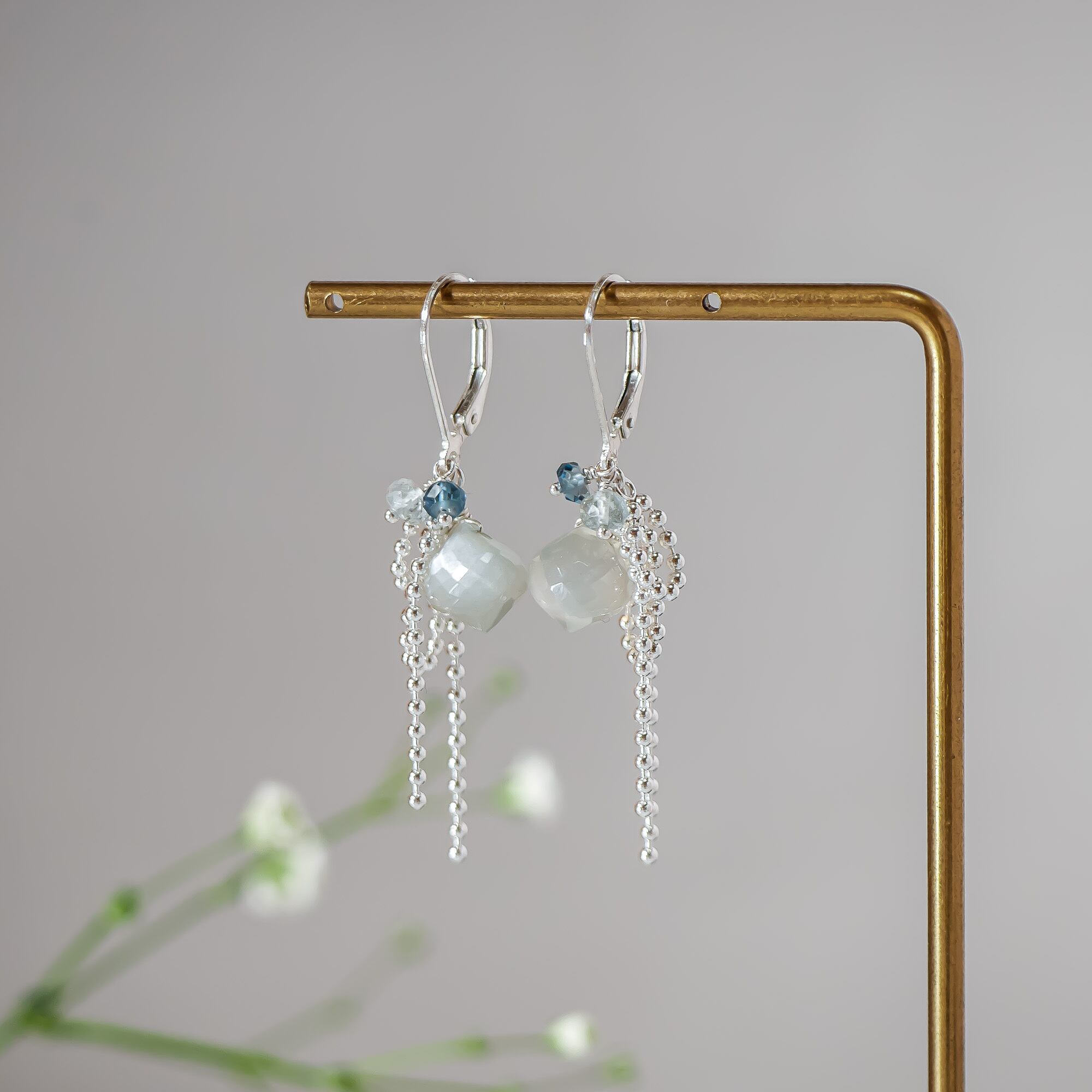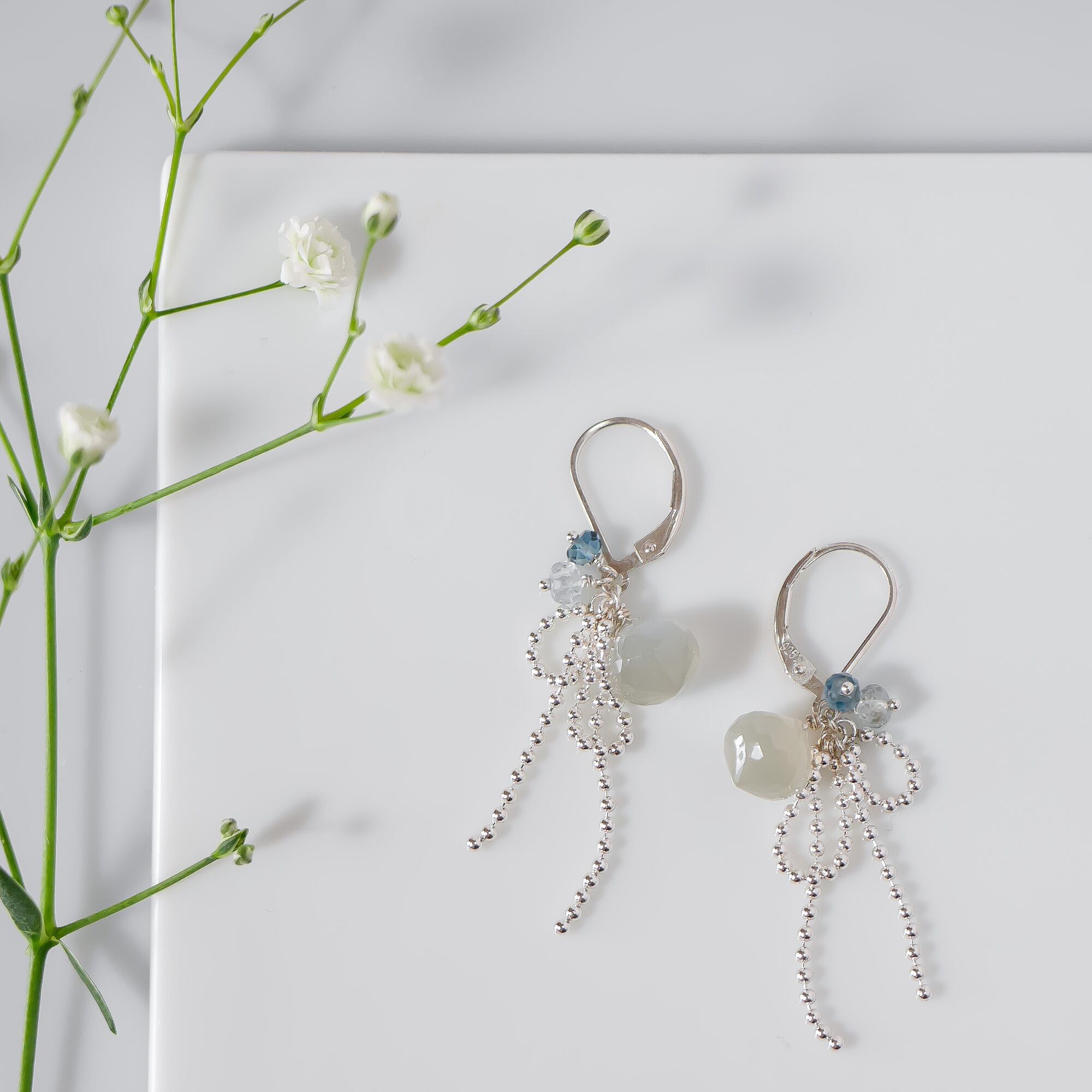 動くたびにやさしく揺れ、グレームーンストーンの静かな艶と透明感を引き立てます。