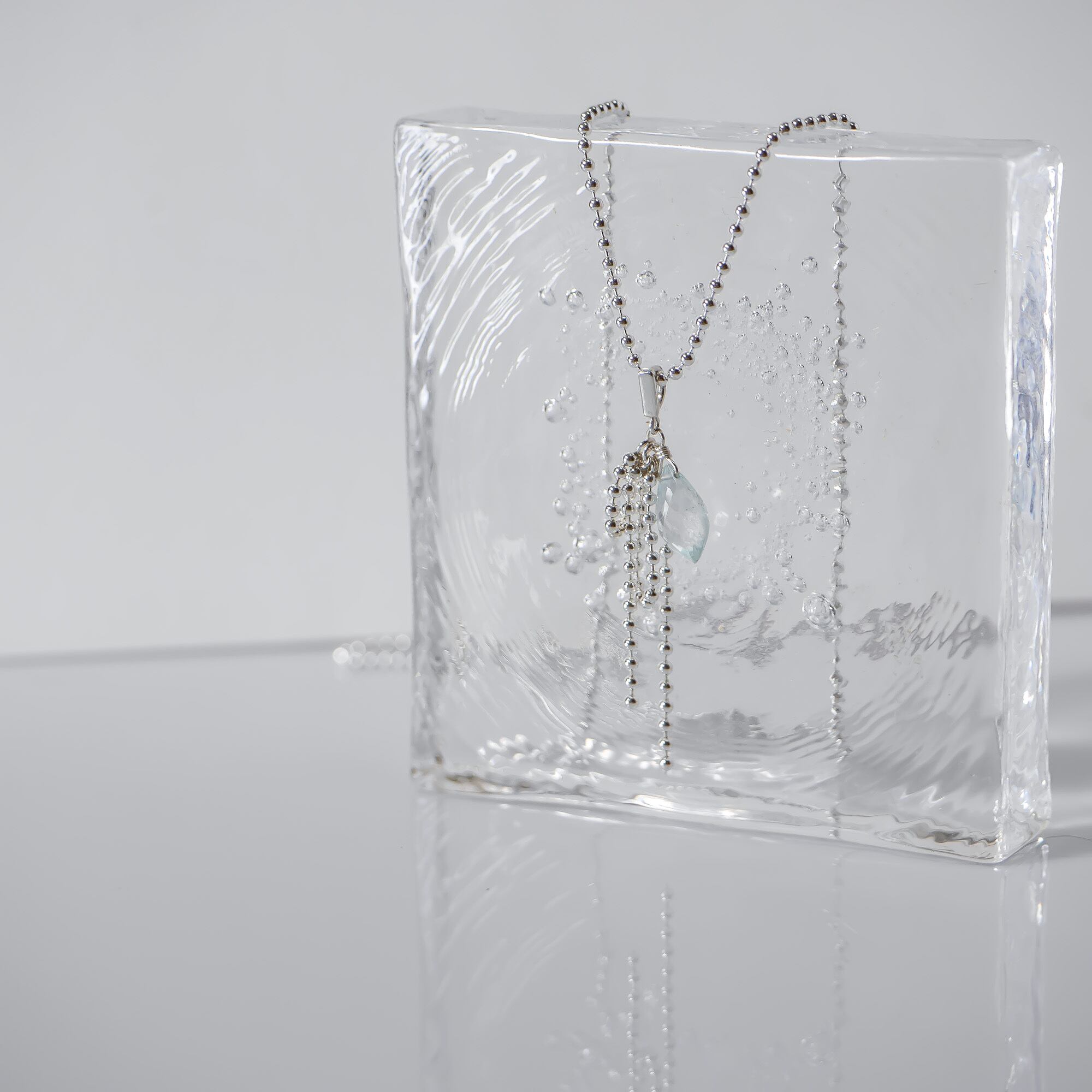 マイクロカットを施した、先端がシャープなシャンデリアカットのアクアマリンを主役にしたネックレスです。