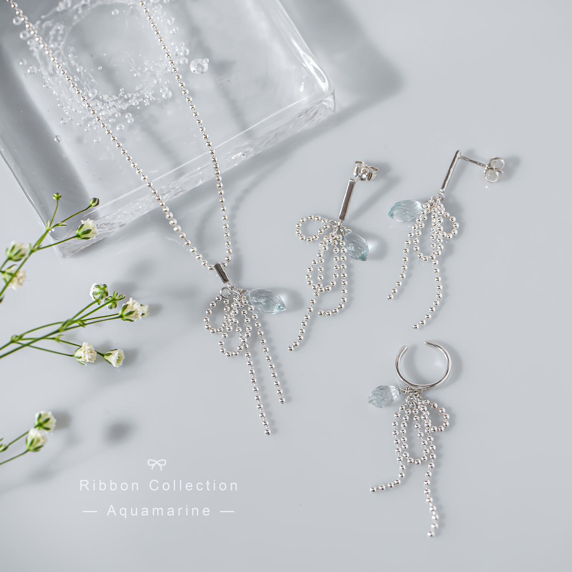 Silver925 アクアマリンのRibbonネックレス40cm[1089N]