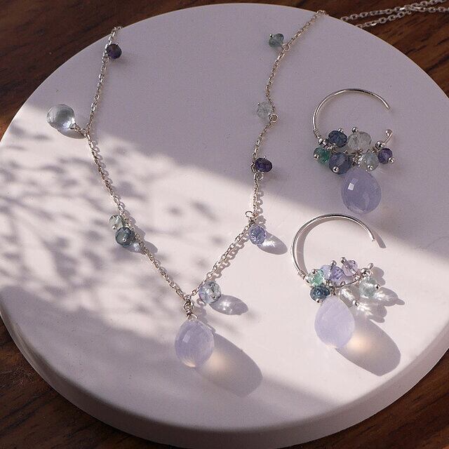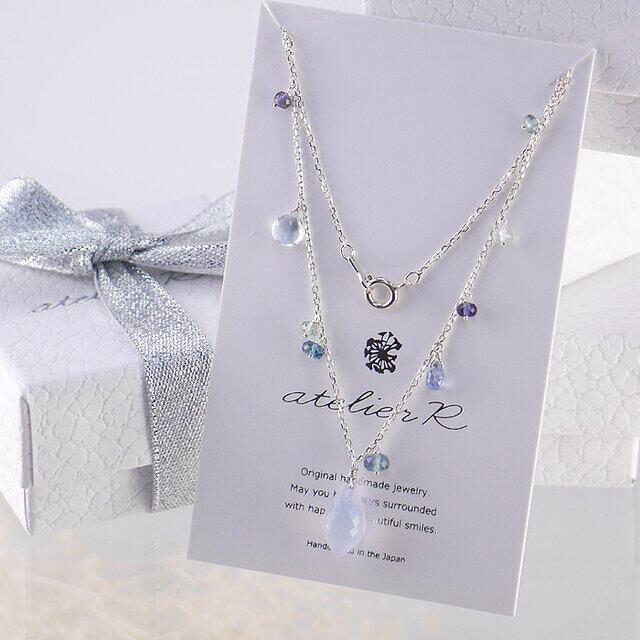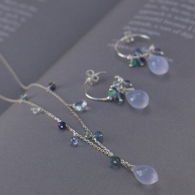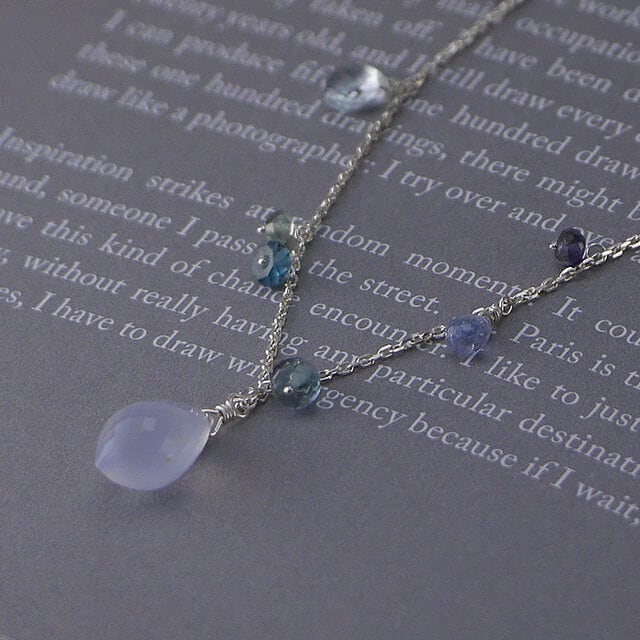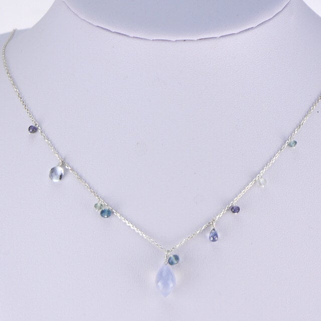 淡いブルーが美しい天然カラーのカルセドニーにブルーサファイア、モスアクアマリン、ロンドンブルートパーズ、グリーンアメジスト、フローライト、アクアマリン、アイオライトを施したSilver925製ネックレス