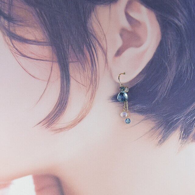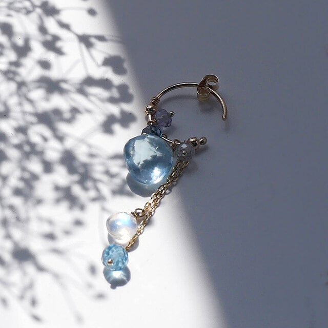 マロンカットのブルートパーズにアイオライト、ロンドンブルートパーズ、レインボームーンストーン、スイスブルートパーズをあしらいました。