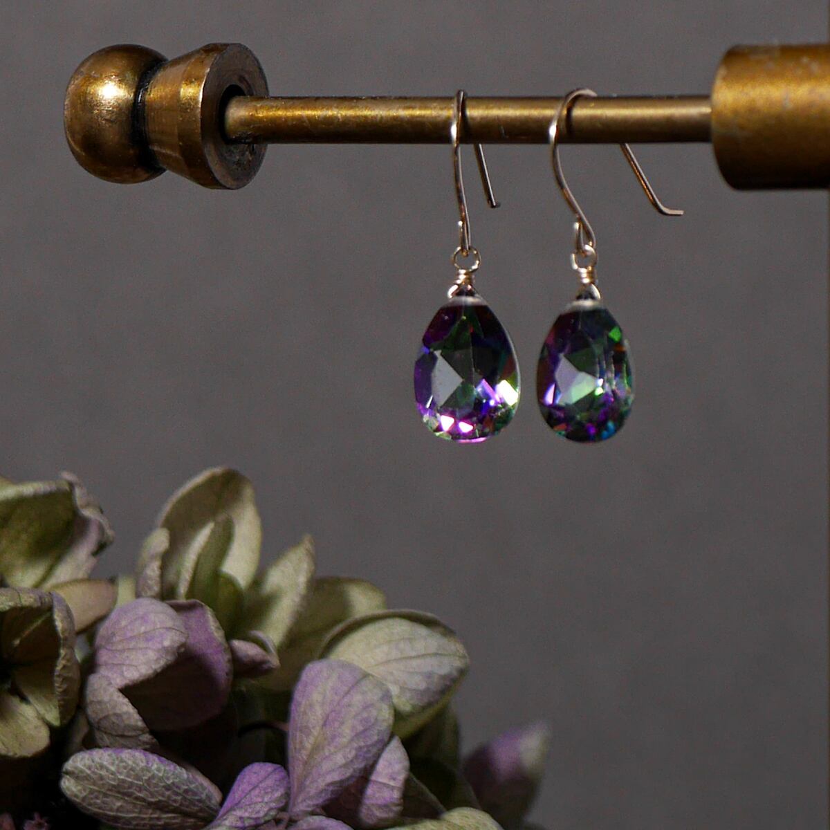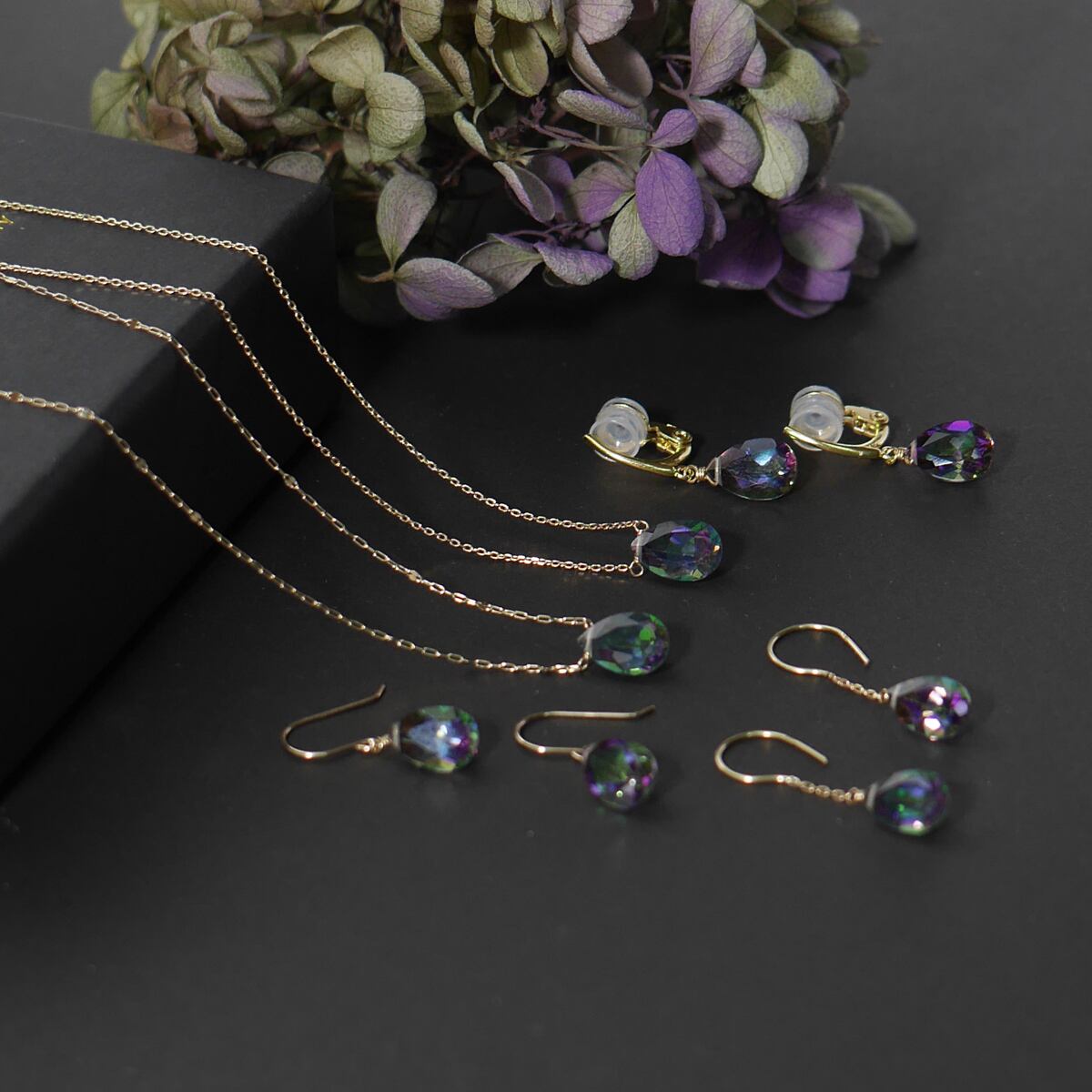 ブルートパーズやピンクトパーズのように無色透明の天然トパーズに加工が施されたもので。ミスティークトパーズは高度な技術で窒素コーティングが施され、神秘的な色合いが魅力です。